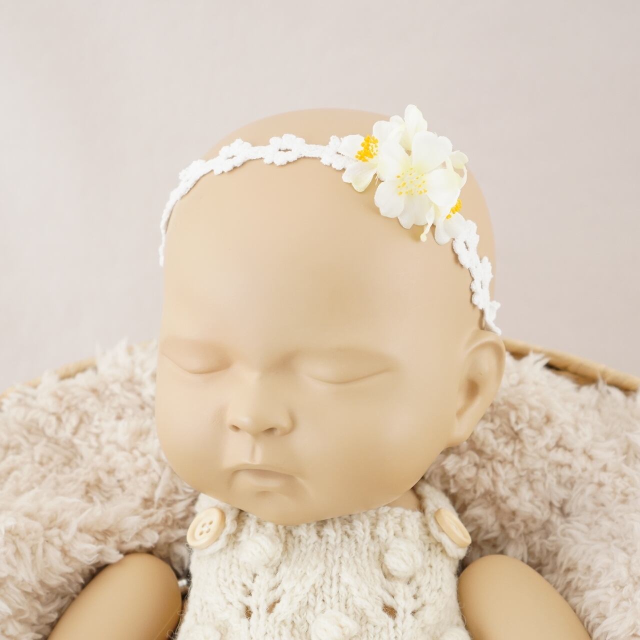 The headband is made with small white flowers arranged on floral lace.