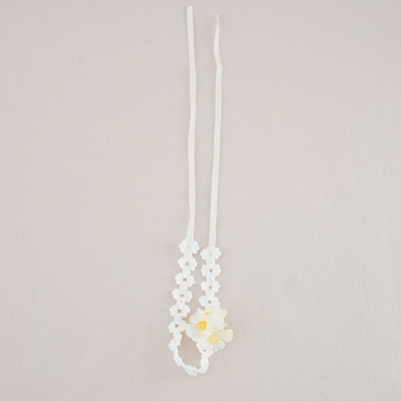 白い小さなお花をお花のレースにあしらいヘッドバンドをお作りしました。
