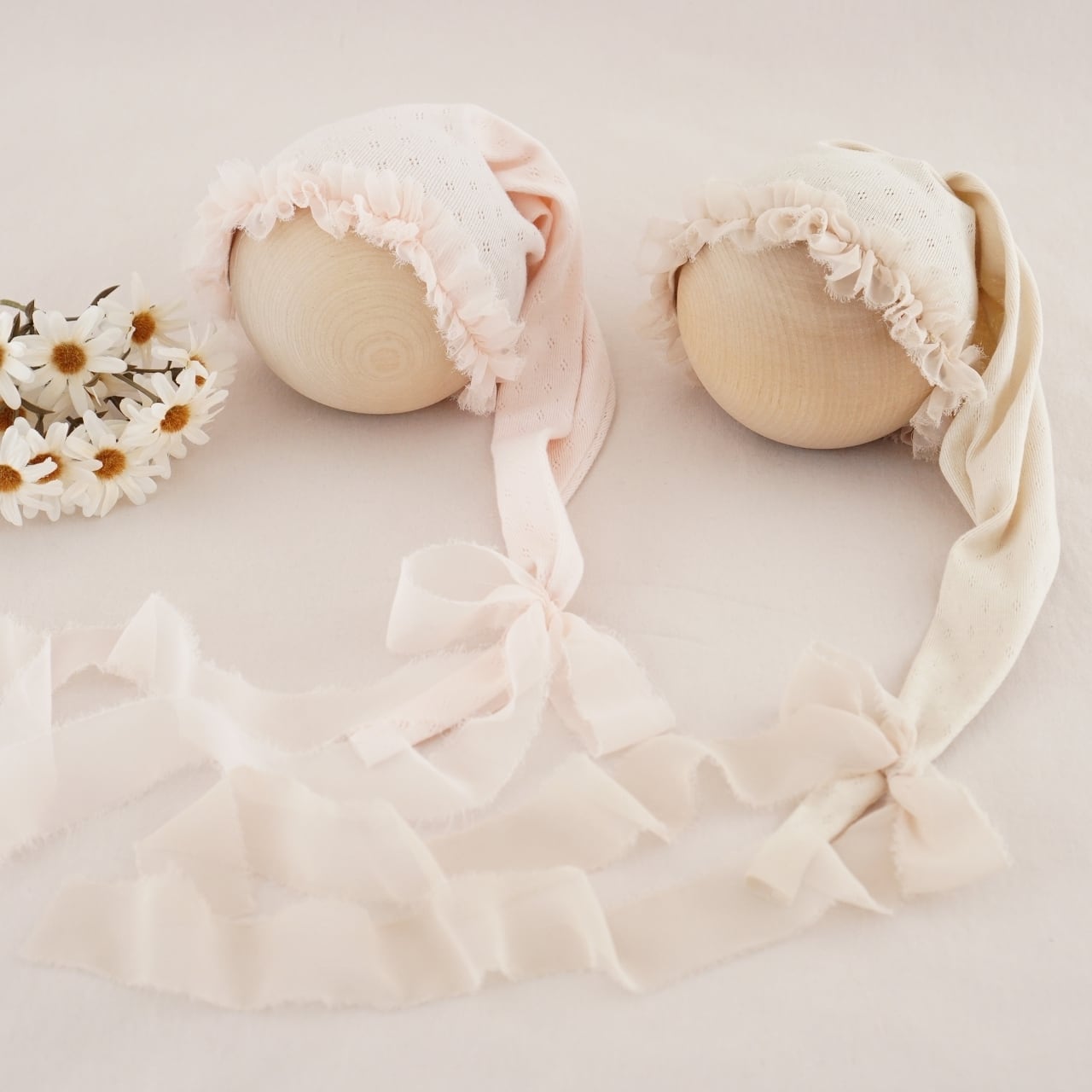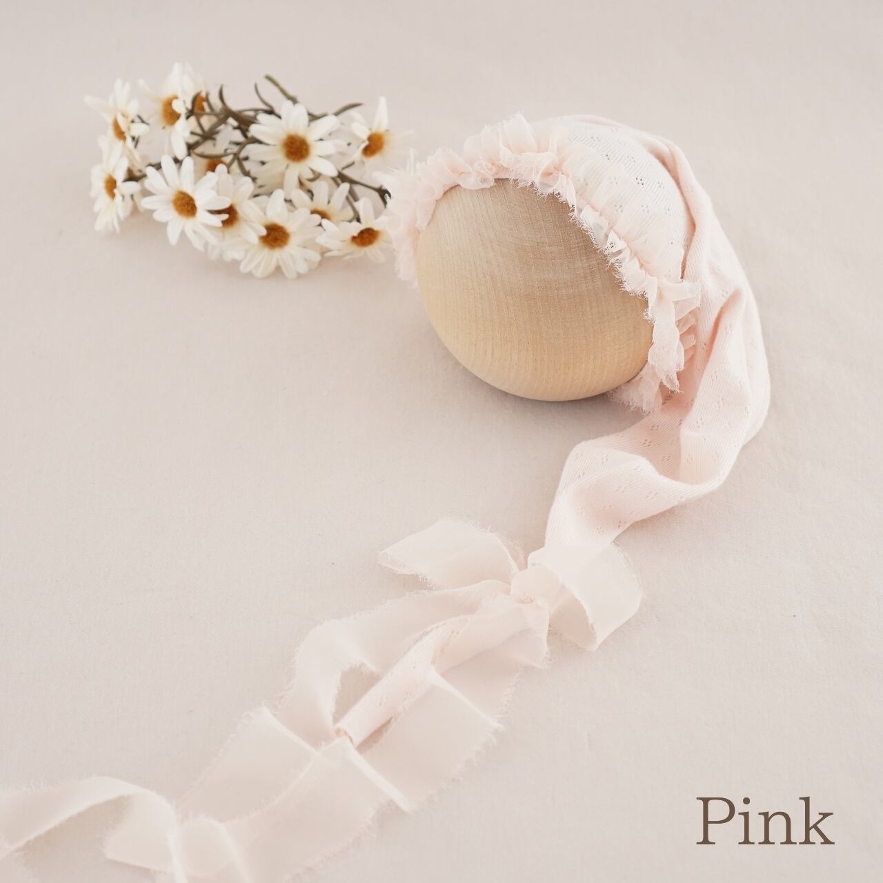 A sleeping hat made of soft knit fabric with chiffon frills and a long ribbon as an accent.