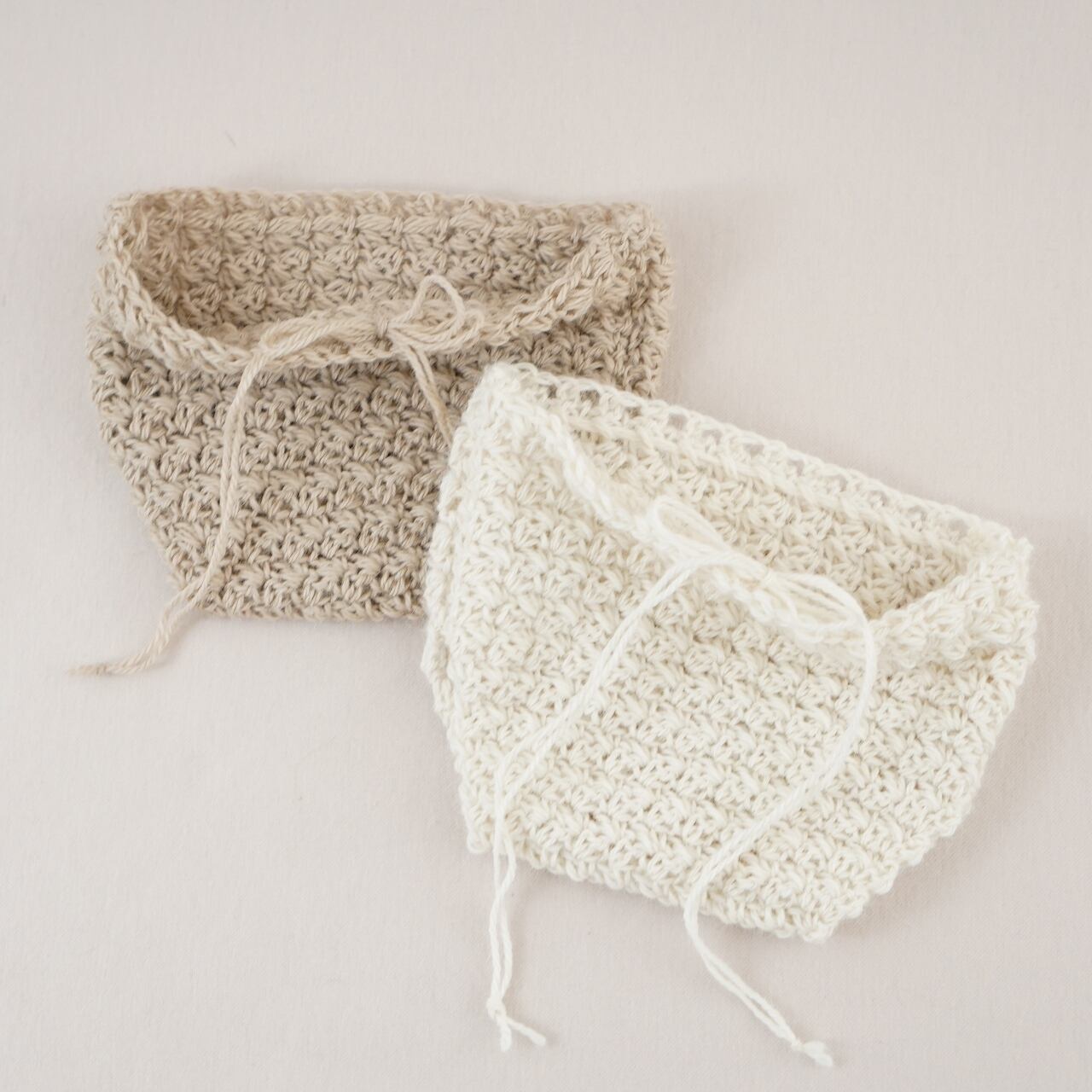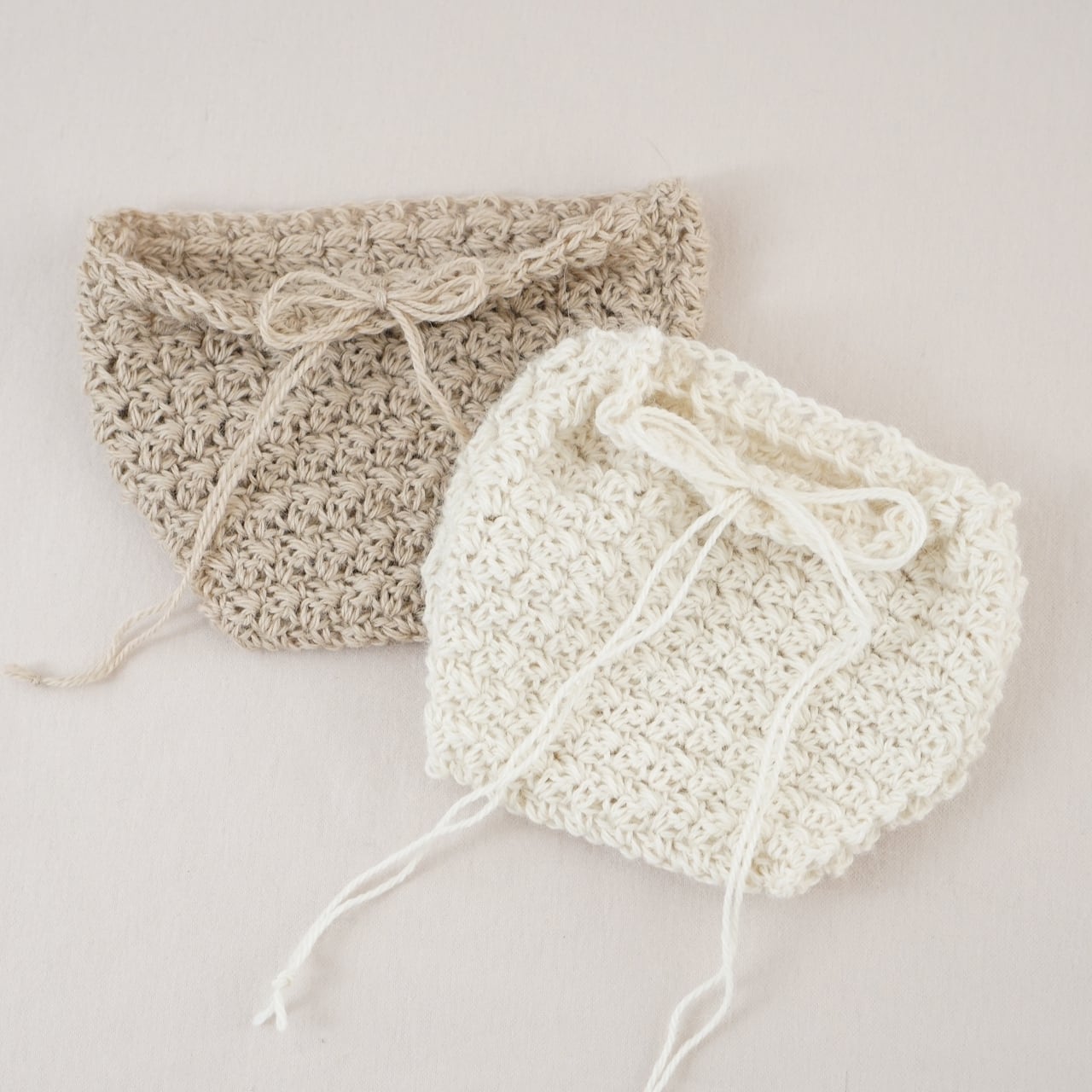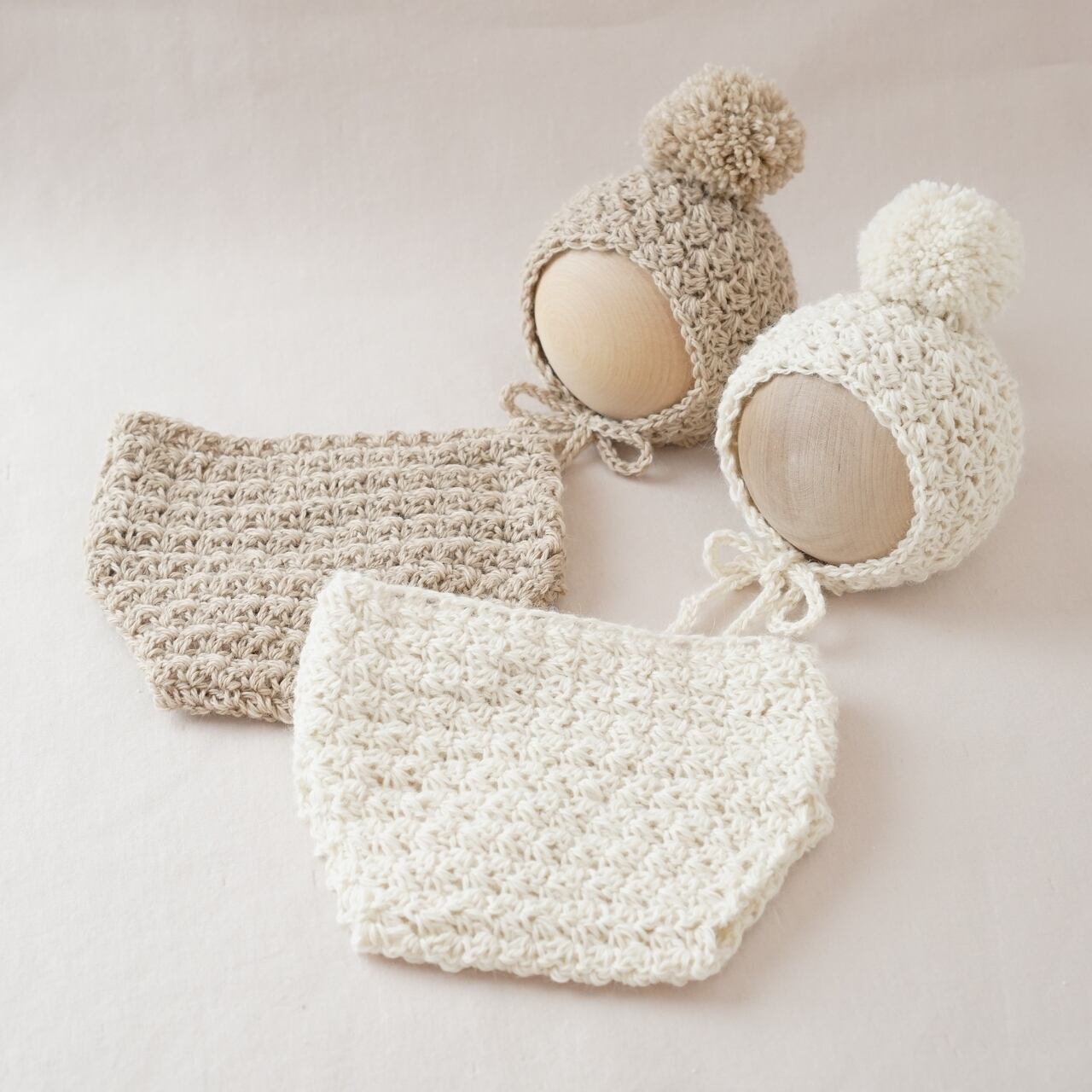 ベビーアルパカポンポンボンネット、ベビーアルパカピローカバーと同じ毛糸で編まれています。