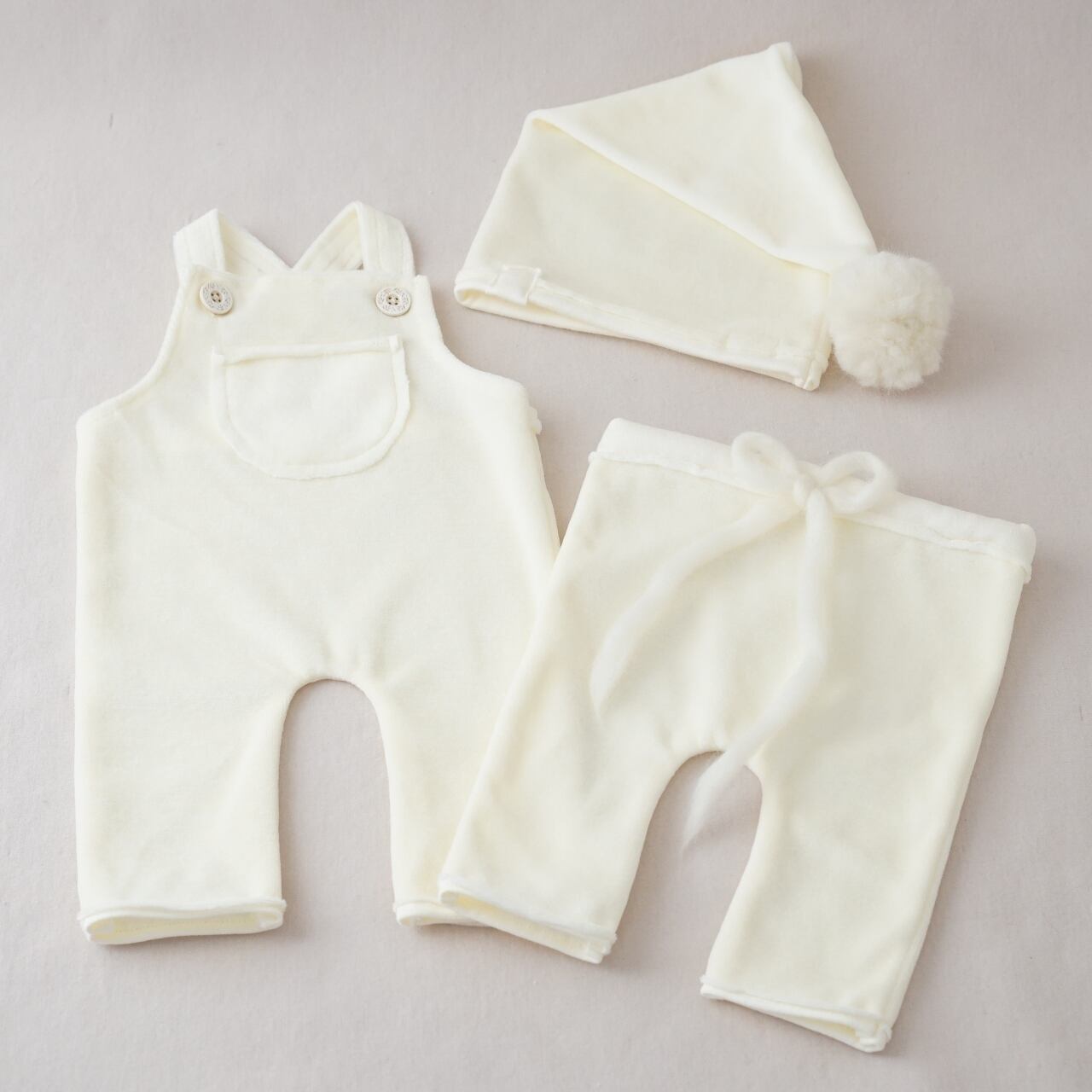 Made from the same fabric as the creamy velour overalls and creamy velour sleeping hat.