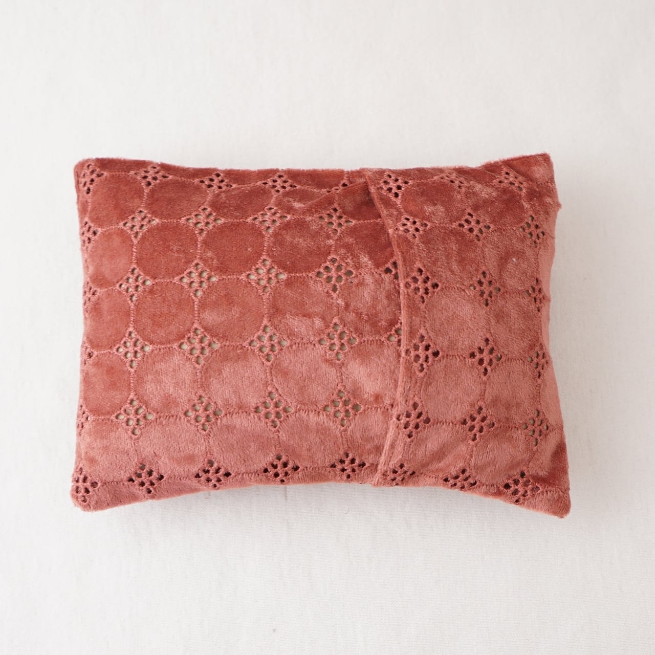 穴あき刺繍が施されている煉瓦色ベルベットでピローカバーをお作りしました。
