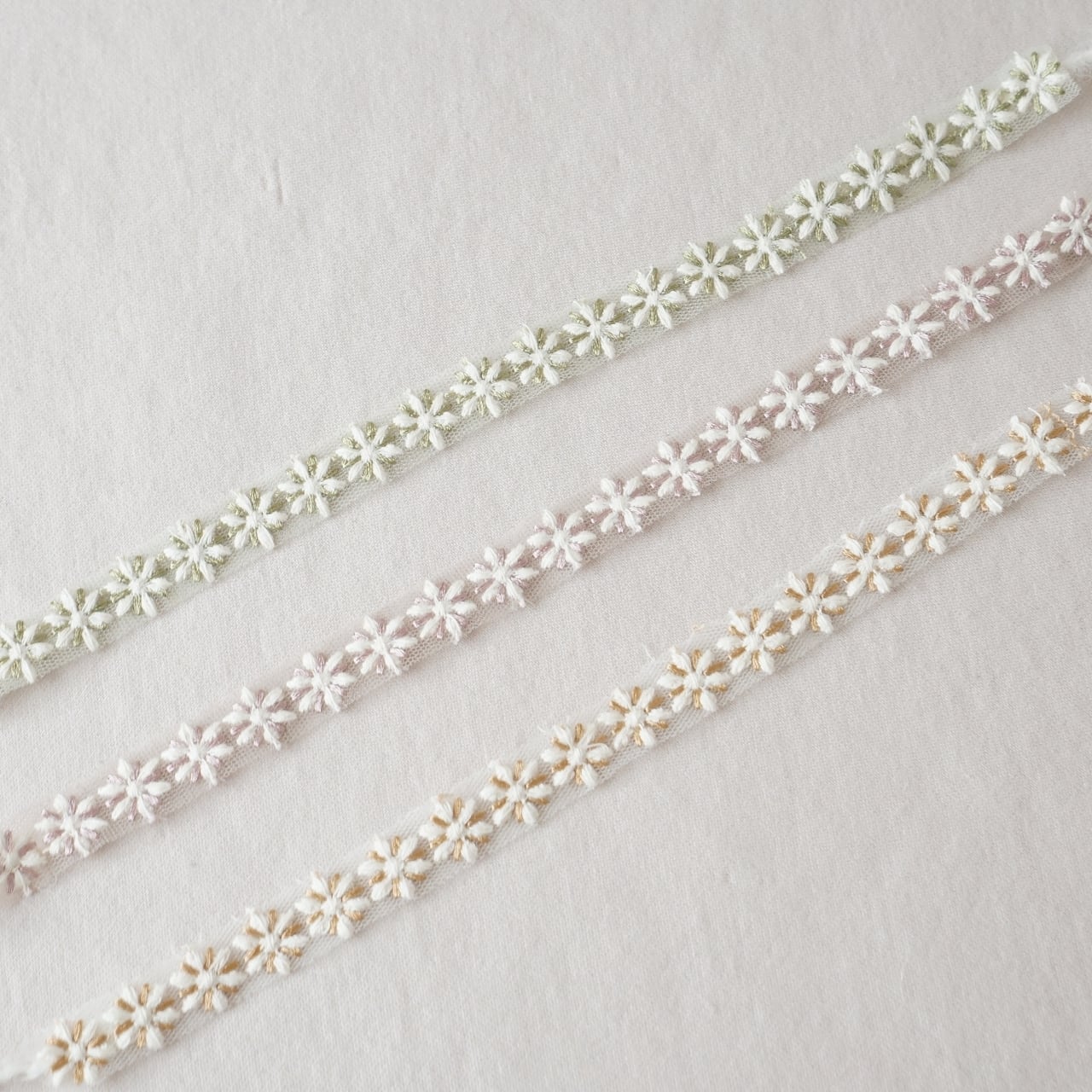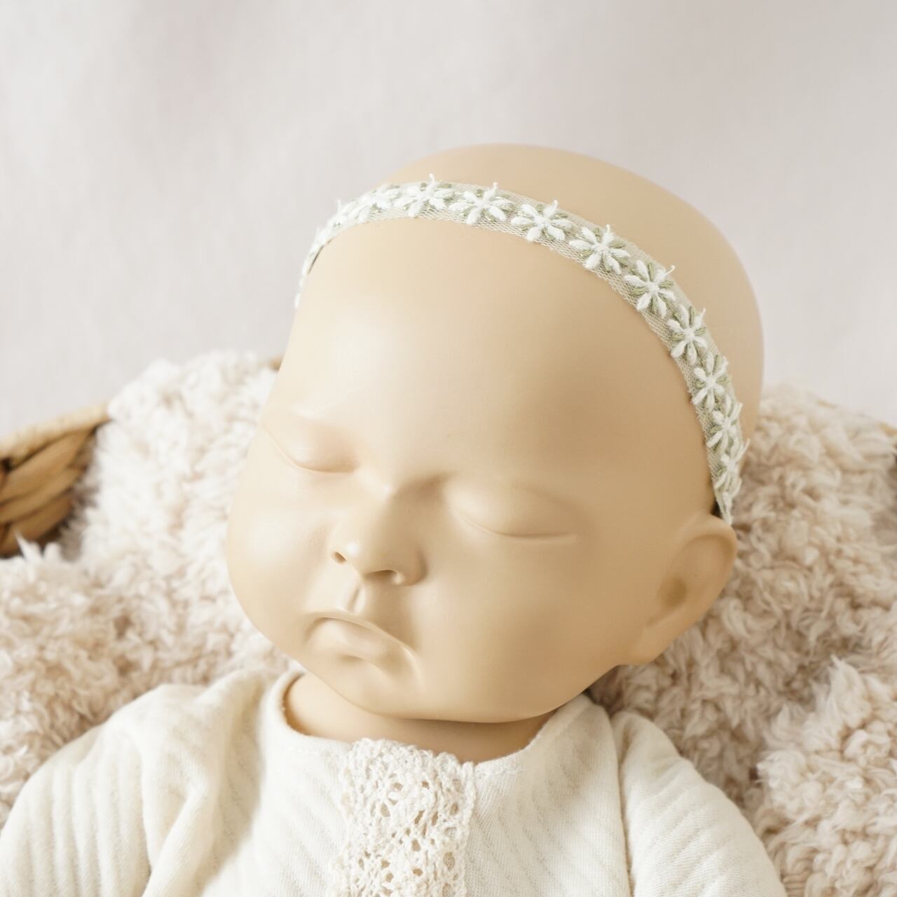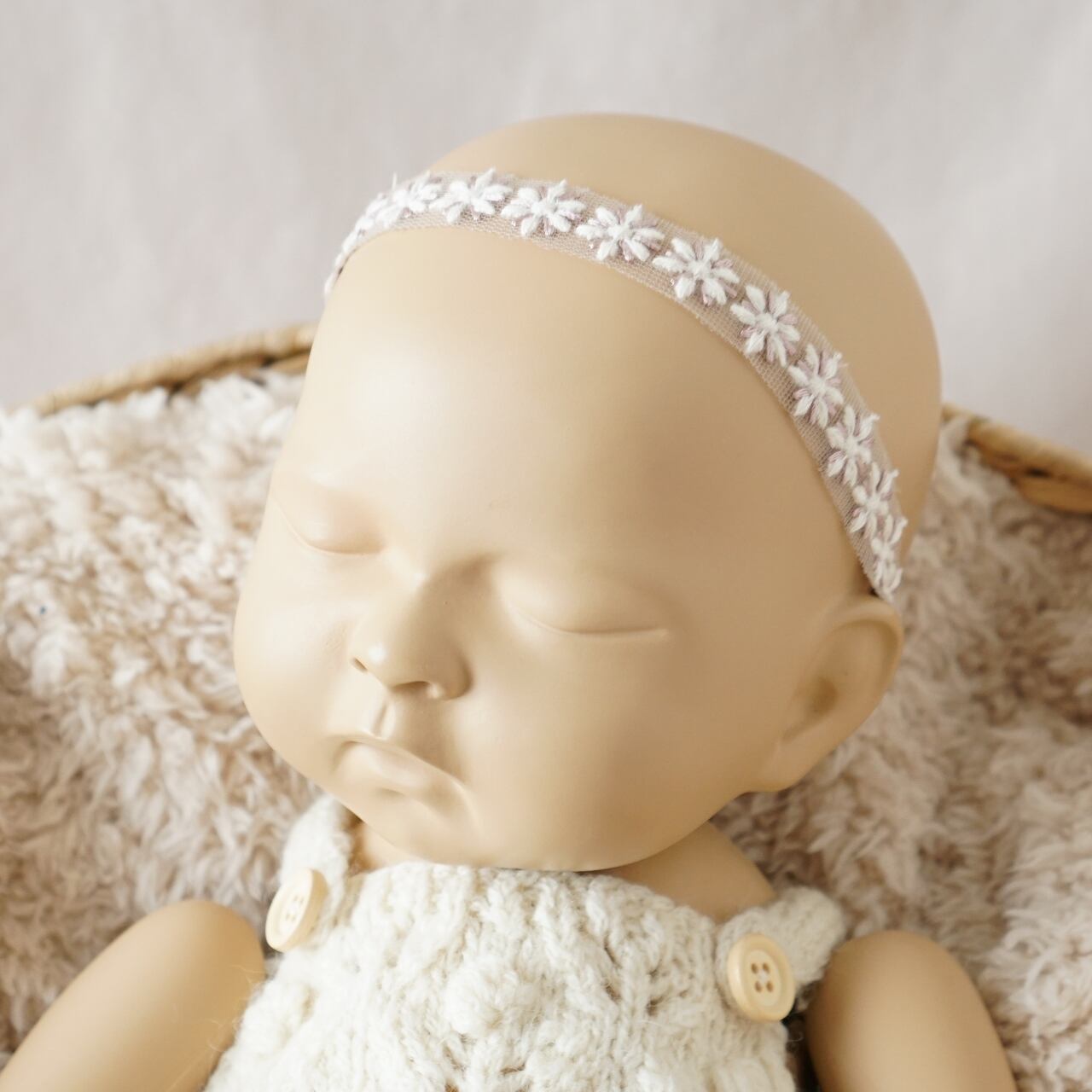 This headband features a tulle ribbon embroidered with subtle flowers and leaves.