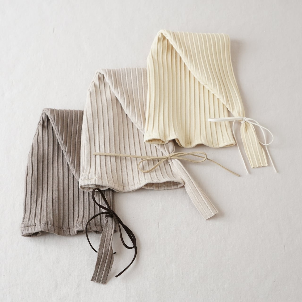 リブニットにフェイクレザーのリボンが可愛いスリーピングハット。