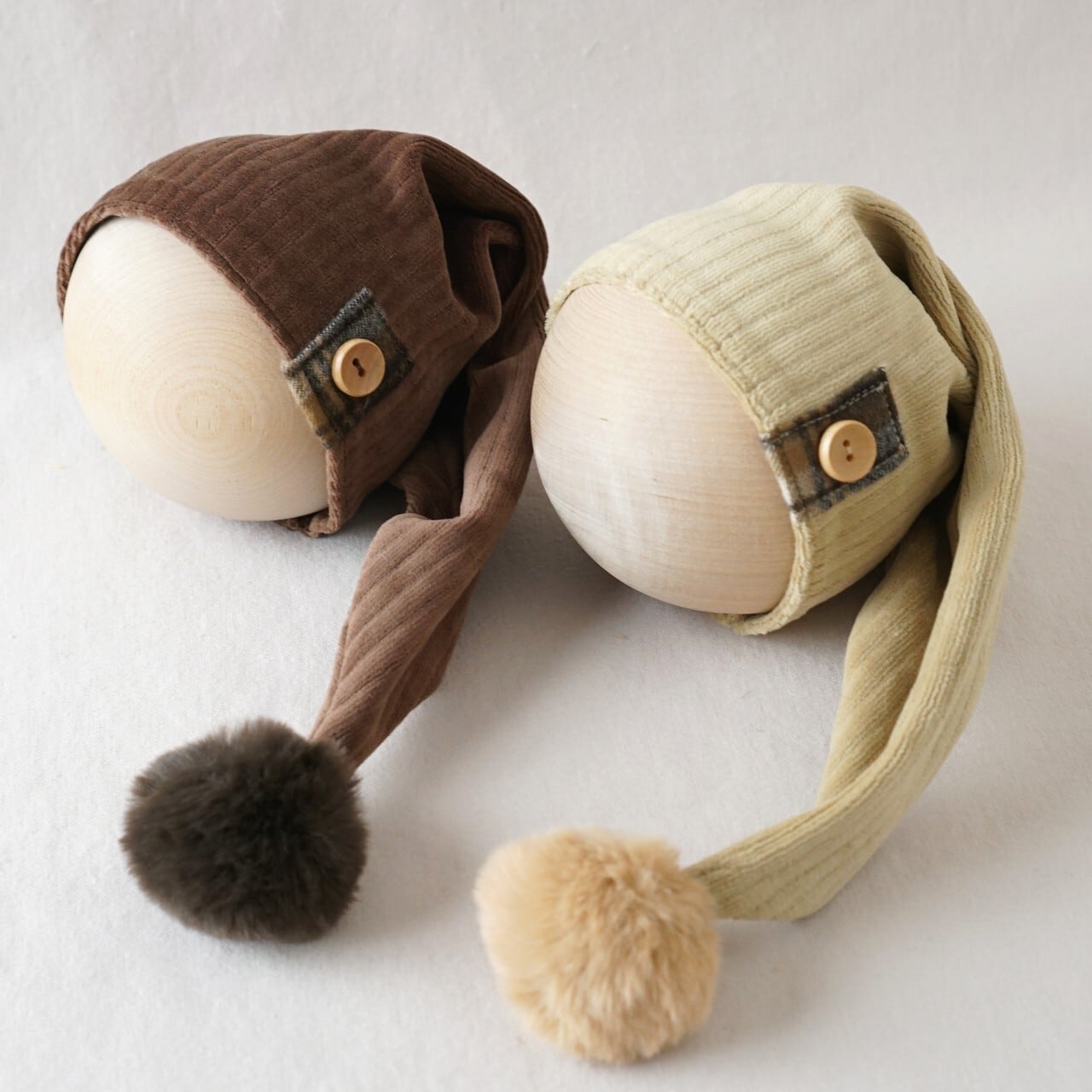 季節感漂うコーデュロイにポンポンをお付けしたスリーピングハットです。
