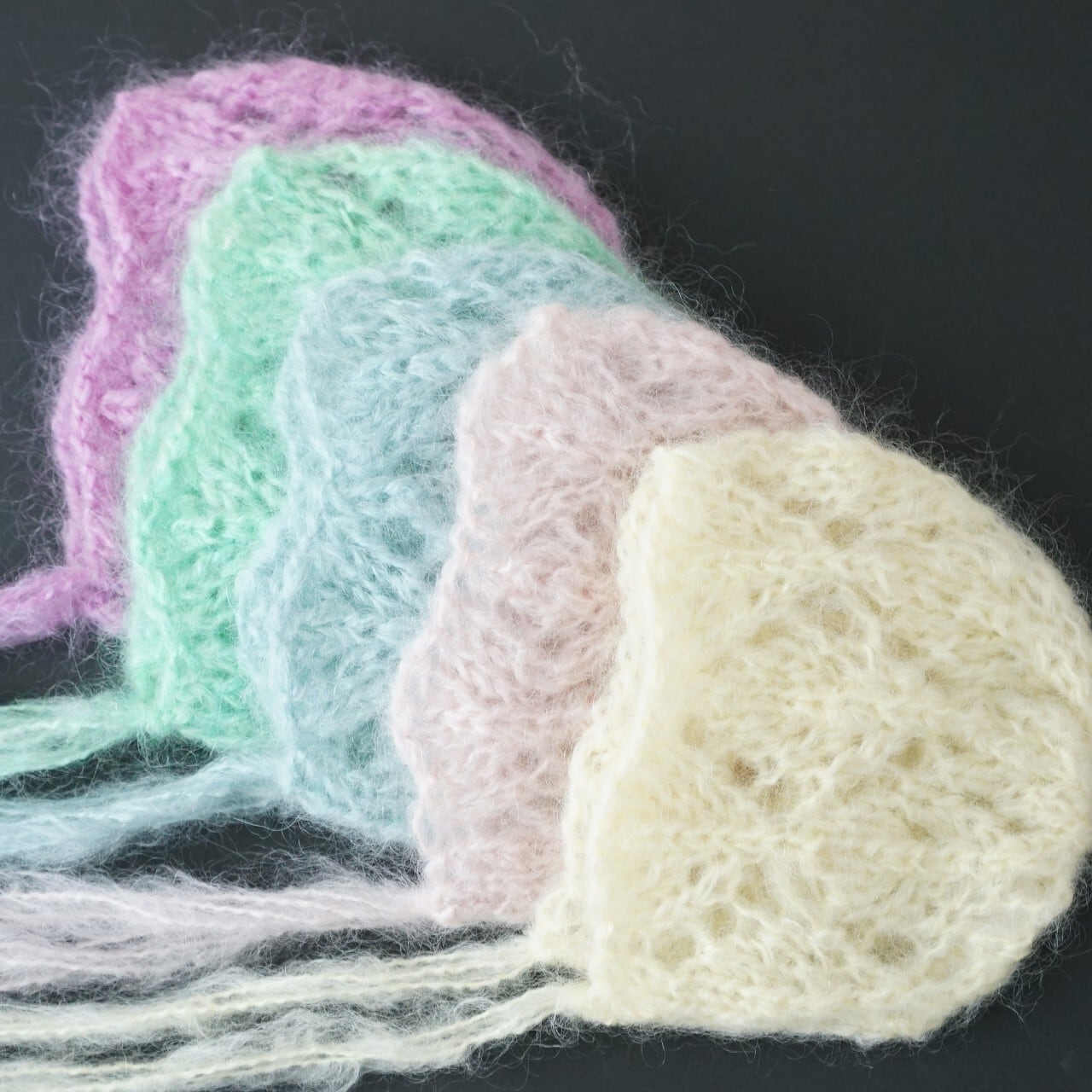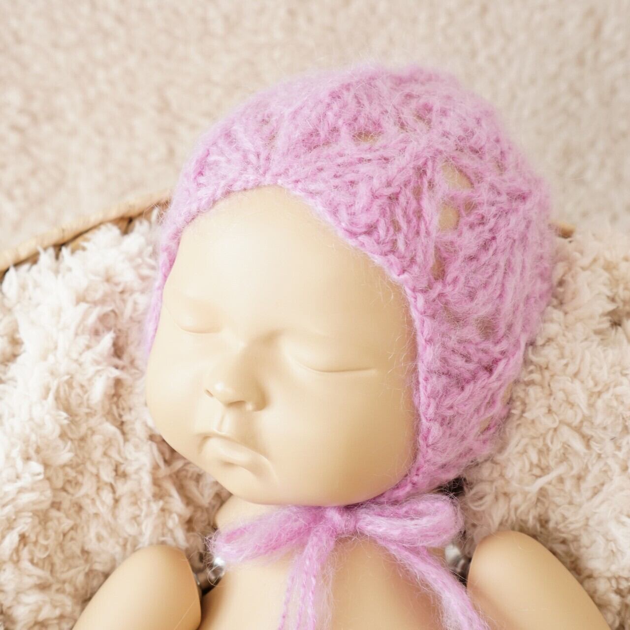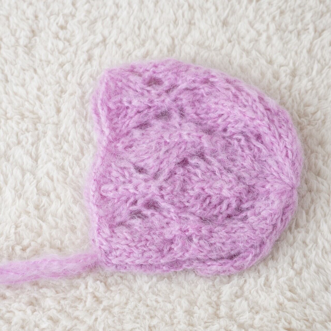 ふわふわのモヘアで透かし編みボンネットをお作りしました。