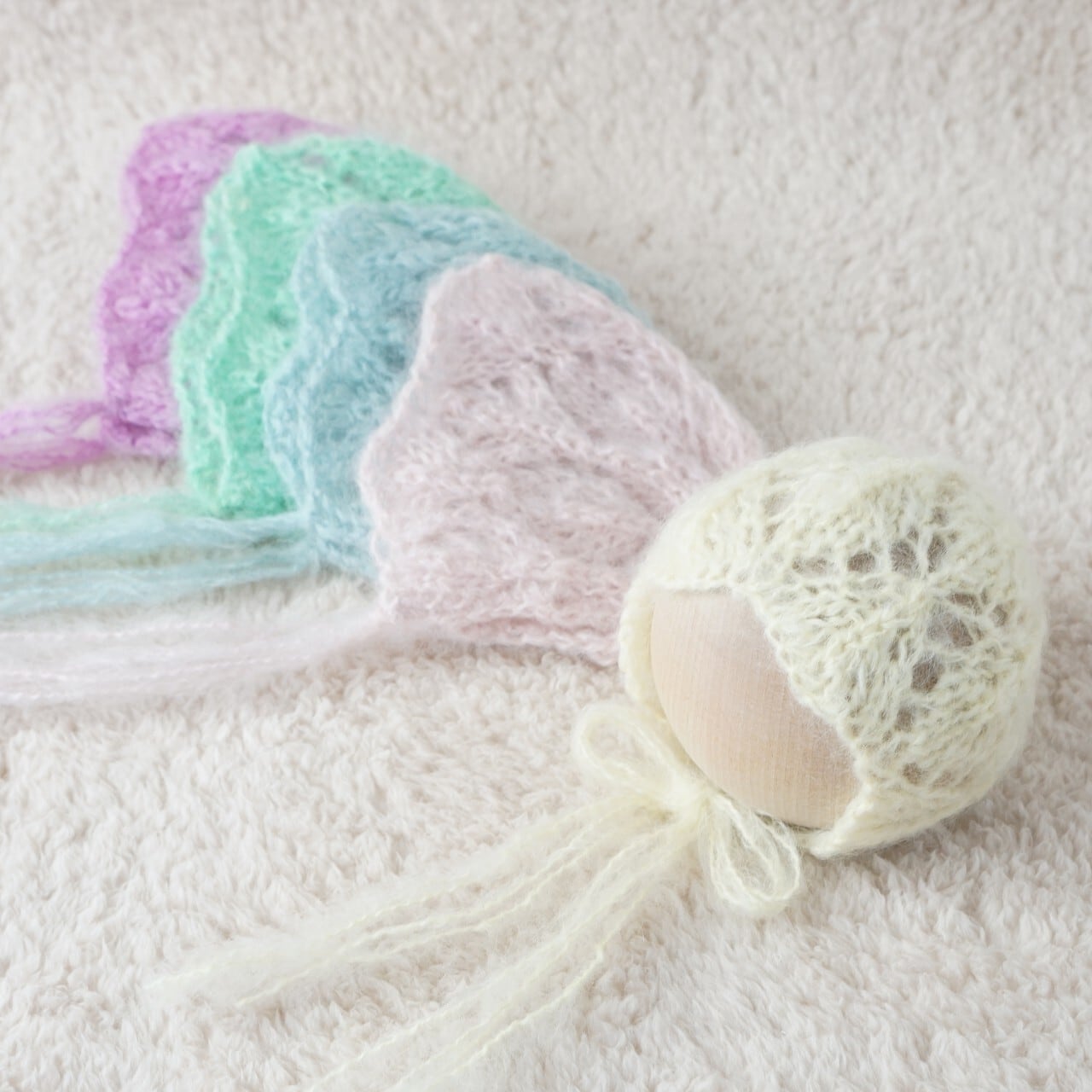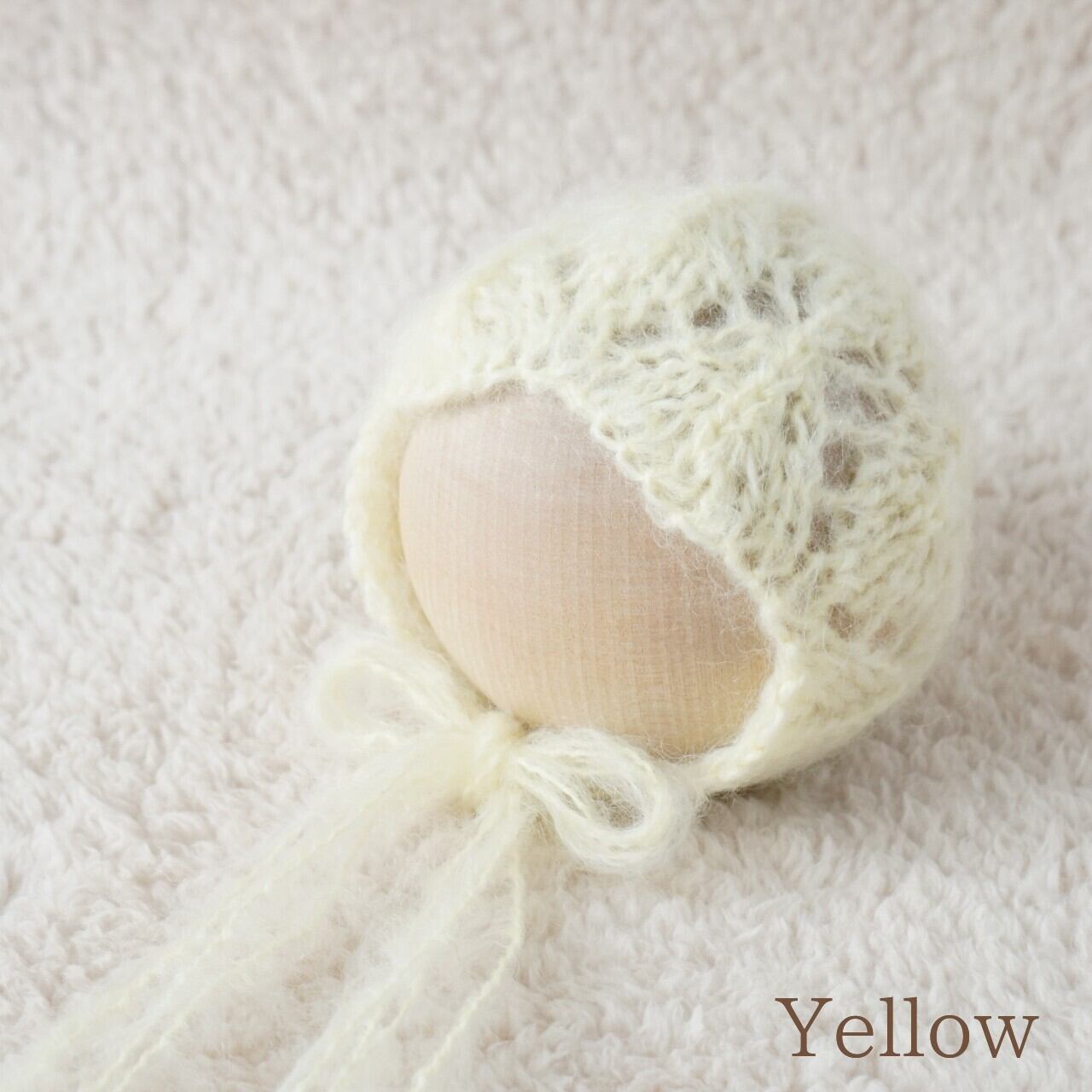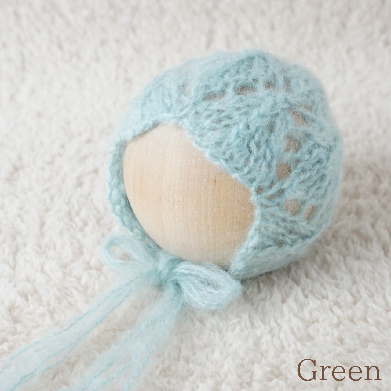 ふわふわのモヘアで透かし編みボンネットをお作りしました。