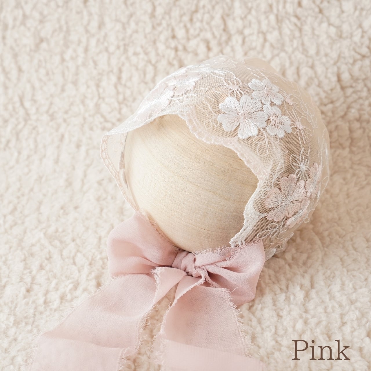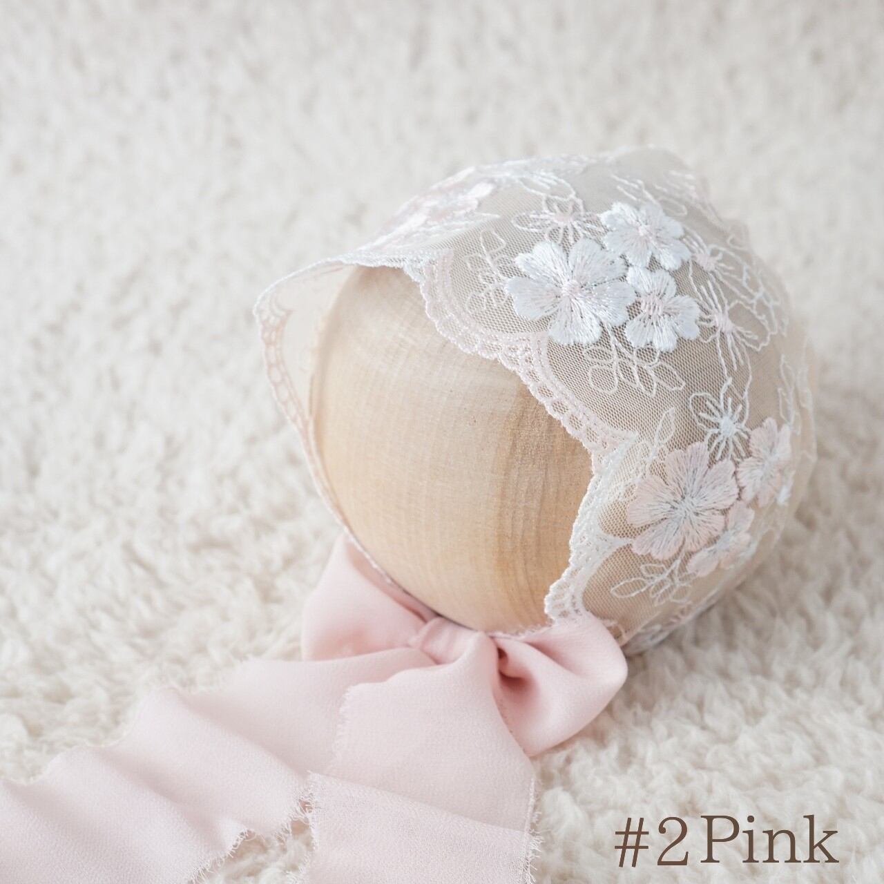 さくらのような刺繍が印象的なボンネット。