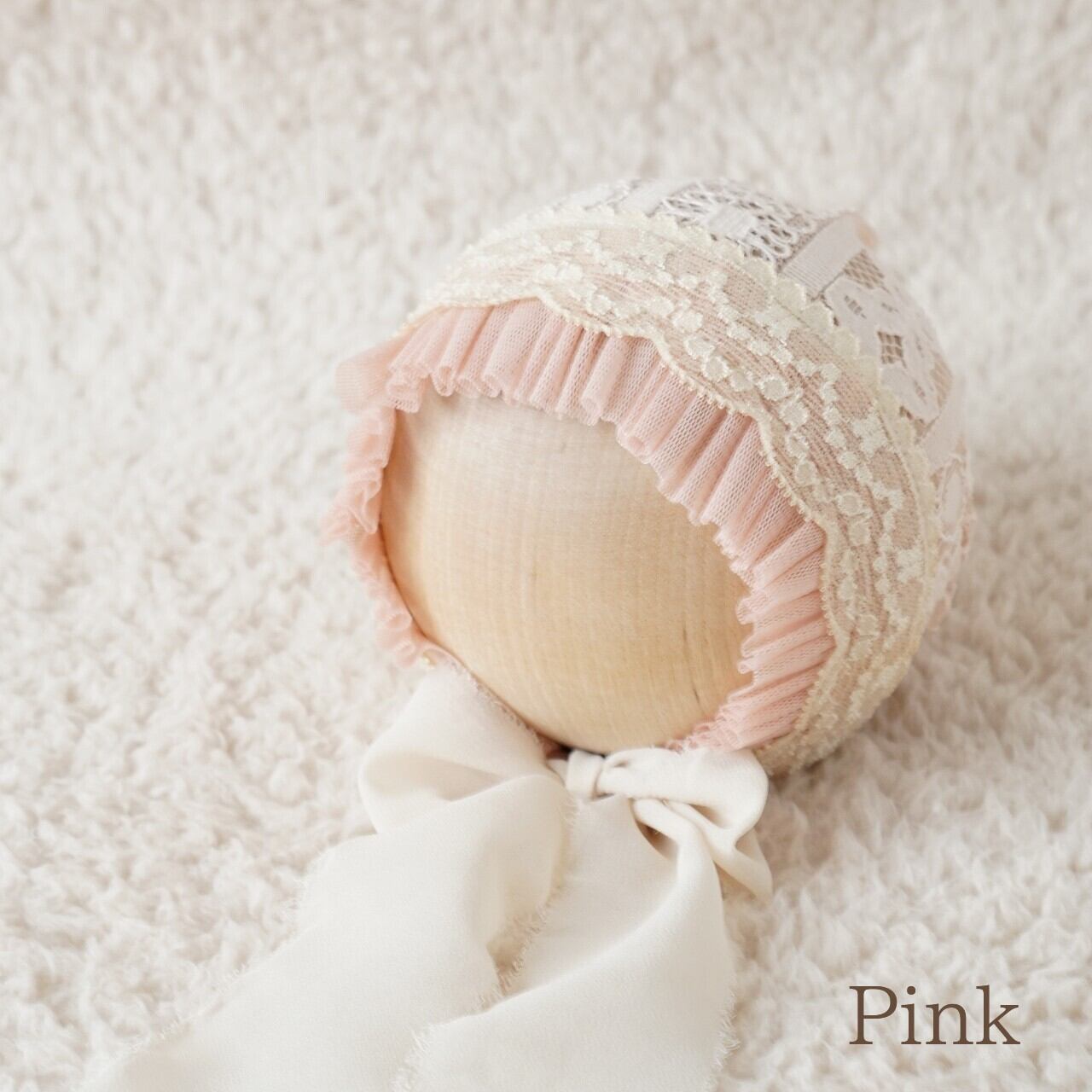 アンティーク感漂うレースを重ねてリッチなボンネットをお作りしました。